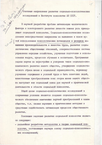 ИПРАН. Ф. 16. Оп. 3.2. Д. 9. Основные направления развития социально-психологических исследований в Институте психологии АН СССР